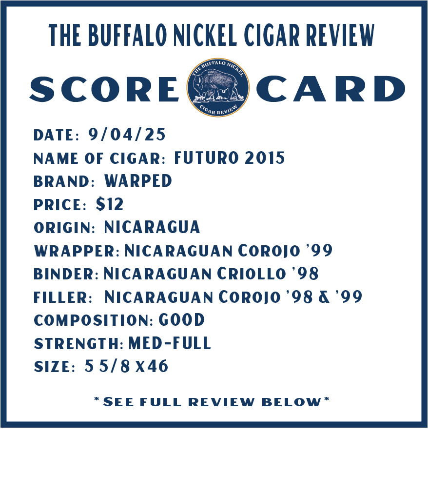 The Warped Futuro 2015 is, simply put, a masterclass in modern blending built on classic, superior tobacco. It provides a rewarding journey from the creamy, refined start to the bold, Graham cracker-sweet finish. The Med-Full strength is well-matched by the full flavors, making it a perfect smoke for an evening of quiet contemplation or a spirited discussion among friends.